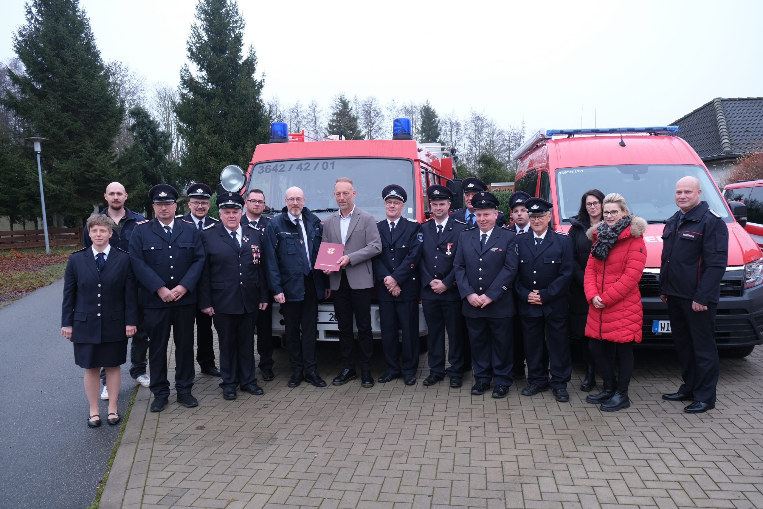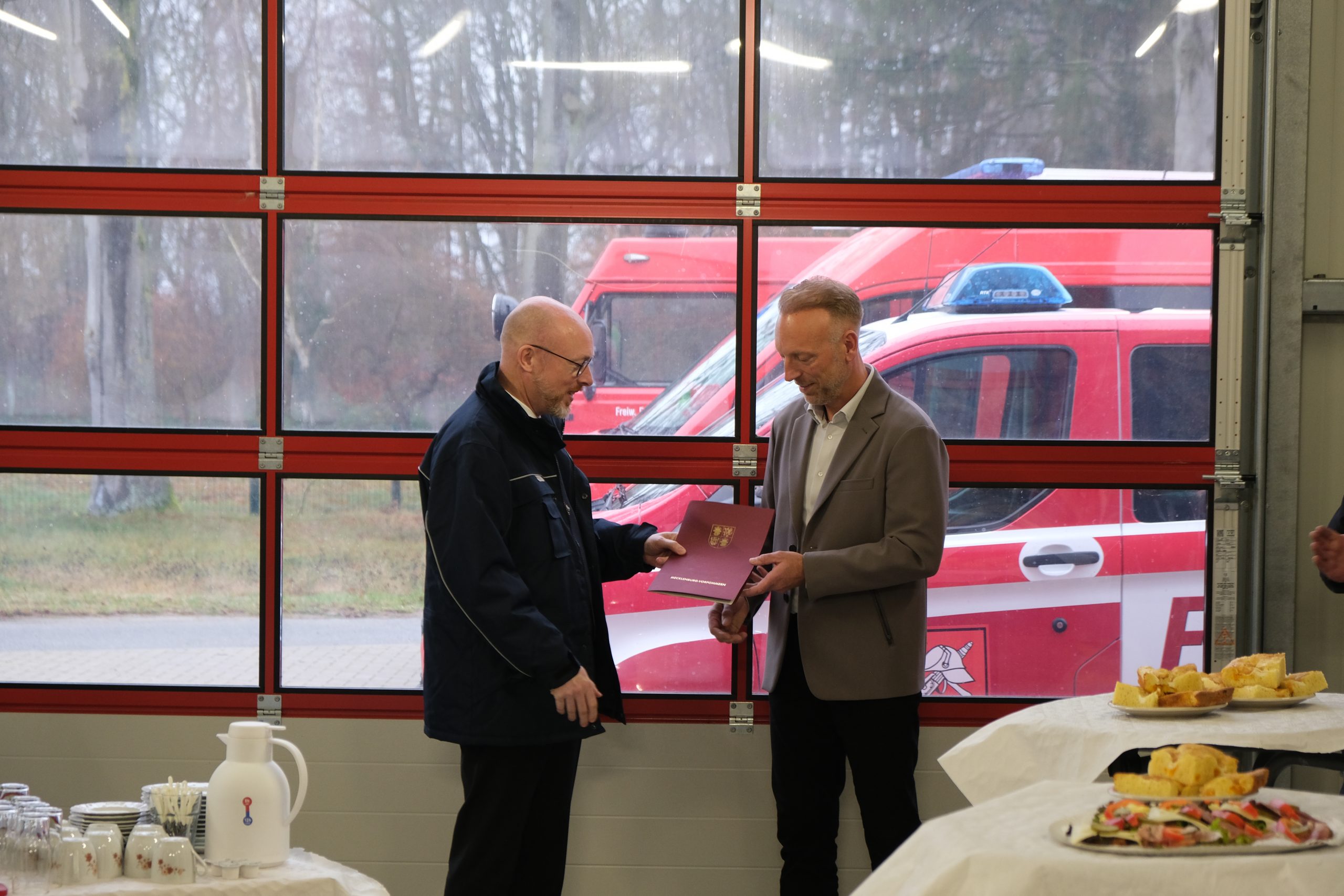 In Anwesenheit von Bürgermeister Mathias Hirsack, Rainer Müller (Stellvertretender Amtswehrführer), zahlreichen Feuerwehrleuten aus Krassow sowie mehreren Mitgliedern der Gemeindevertretung Zurow überreichte Minister Christian Pegel am 22.12.2025 den Zuwendungsbescheid des Landes Mecklenburg-Vorpommern für das HLF 10 für die Freiwillige Feuerwehr Krassow. Ebenfalls mit dabei waren vom Amt Neukloster die Bürgermeisterin Sabrina Bruck und die Leiterin Zentrale Dienste, Marleen Kempken.