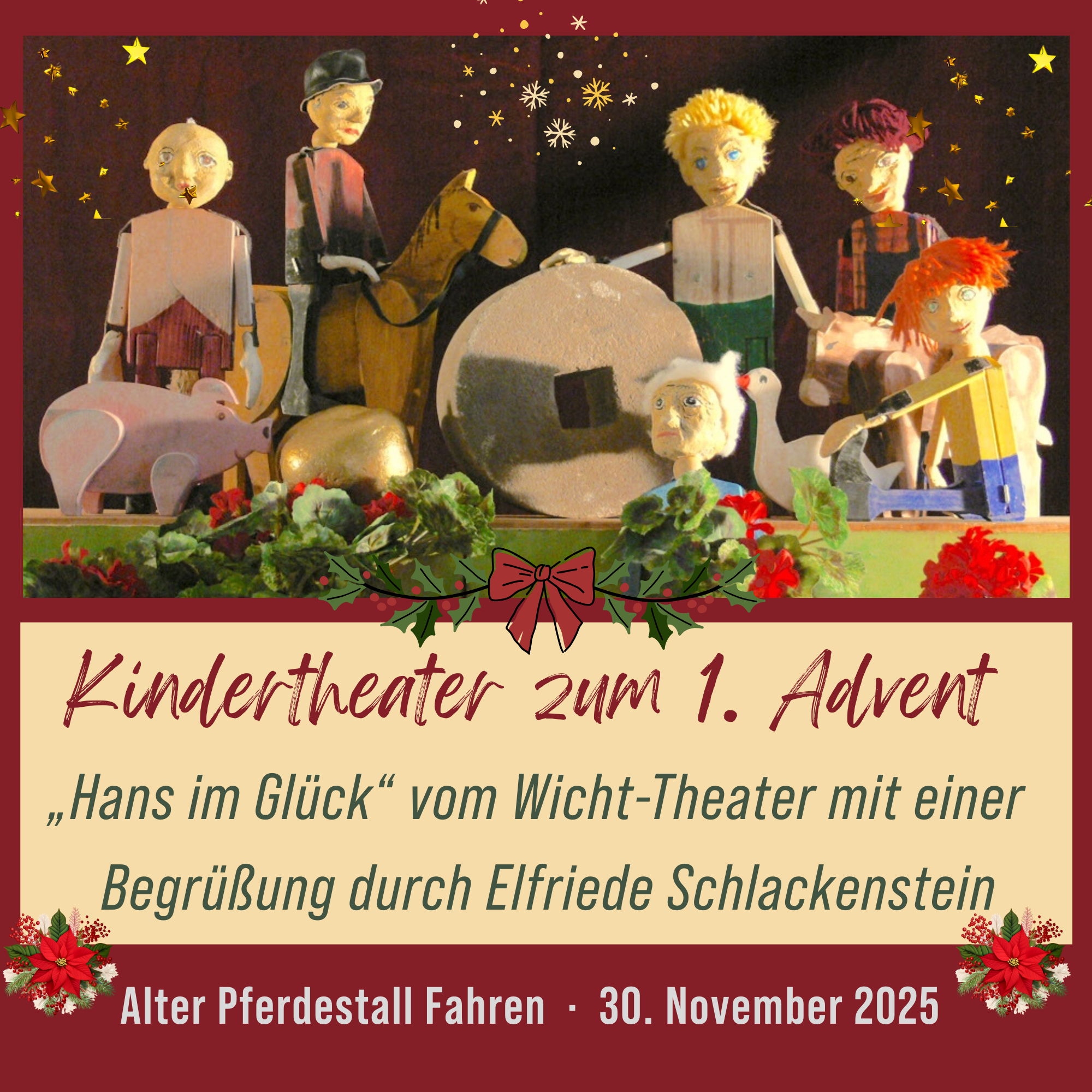 Der Alter Pferdestall Fahren e. V. lädt am 30. November 2025 Kinder von 4 bis 10 Jahren, ihre Eltern, Großeltern, Freunde – und natürlich alle Menschen, die Lust auf einen fröhlichen und herzerwärmenden Nachmittag haben – ein.